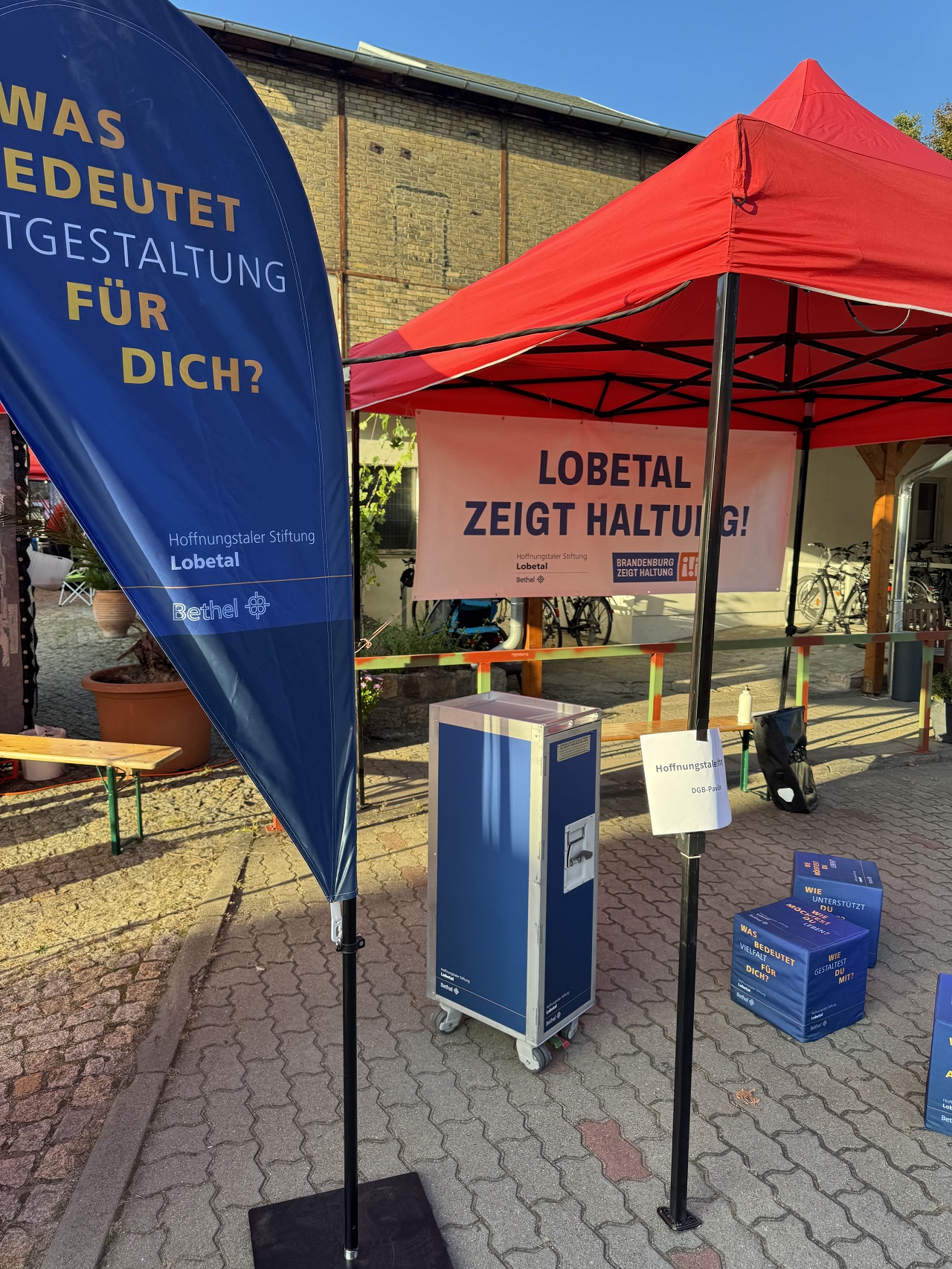 Der Stand besteht aus Beachflags, einem runden mobilen Messetisch, Sitzwürfeln und einem Rollcontainer voller Materialien – vom Infopaket in leichter Sprache bis hin zu interaktiven Fragenkarten. Alles ist so gestaltet, dass Menschen unkompliziert ins Gespräch kommen und sich einbringen können.