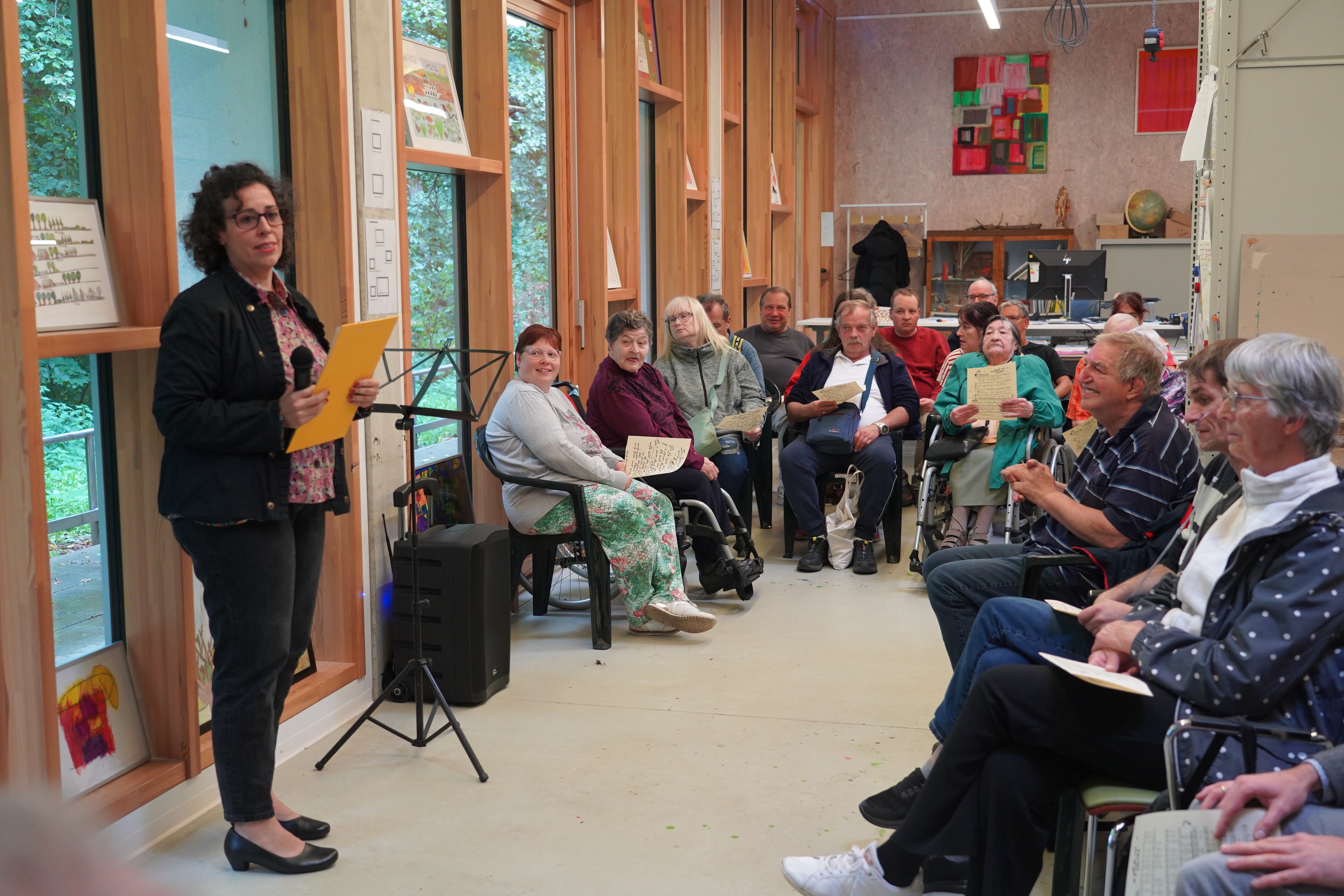 Ana Fernández Furelos, die die Werkstatt koordiniert, begrüßte die Anwesenden im architektonisch überzeugenden Ort, „der der Kunst Raum für Austausch und Öffentlichkeit gibt“. Menschen mit Beeinträchtigung oder psychischer Erkrankung könnten hier mit Unterstützung frei, ehrlich und eigenständig ihre Kunst ausüben. Sie erinnerte daran, dass so der Grundstein für mittlerweile über 300 Ausstellungen hiesiger Künstlerinnen und Künstler gelegt wurde. Ein Ort, der ihren Werten und ihrer Kraft eine einzigartige künstlerische Stimme ermöglicht.