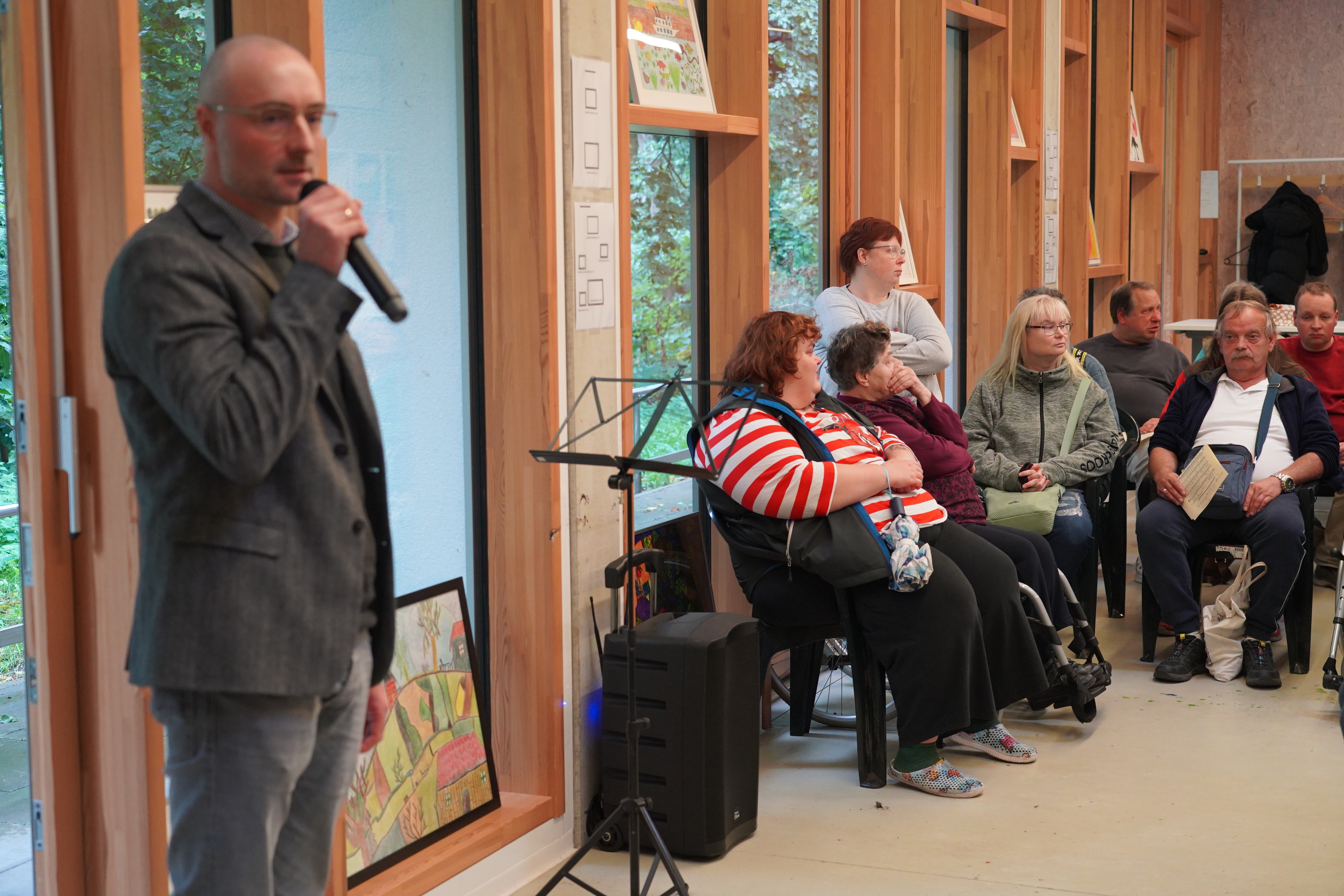 Dr. Benjamin Bell, Geschäftsbereichsleitung Teilhabe, wurde grundsätzlich: „Ohne Kunst und Kreativität gäbe es die Menschheit doch gar nicht.“ Auch im Namen seines Kollegen Joachim Rebele würdigte er die Vielzahl der hier initiierten Kunstwerke und Ausstellungen: „Mit Kunst, das bewiest der Tag heute, kann man Freude machen. Begeistern Sie uns weiter mit I h r e r Kunst.“