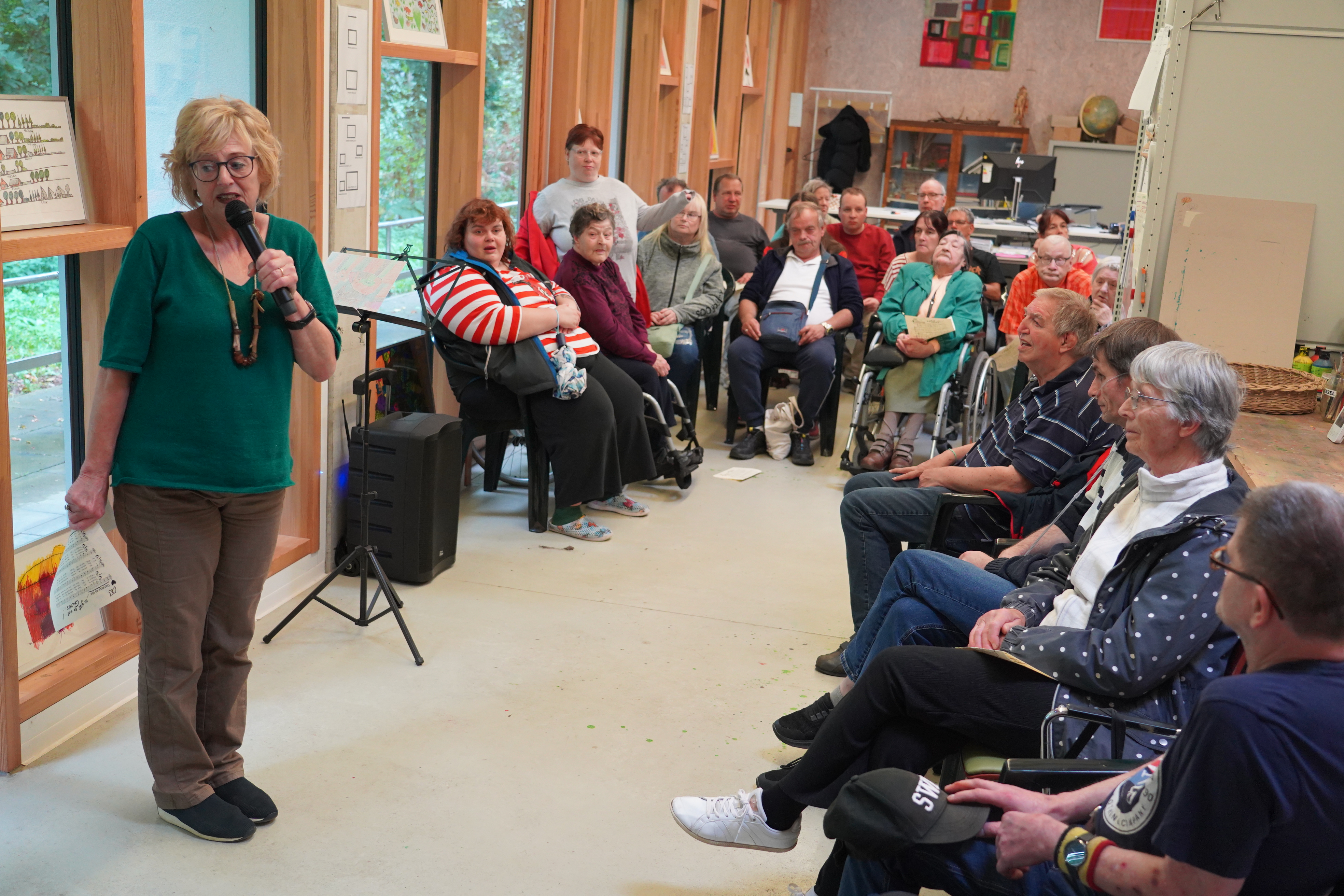 Dr. Claudia Schmidt-Rathjen, Archivmitarbeiterin der Stiftung, erinnerte an die Anfänge der kreativen Arbeit mit Bewohnerinnen und Bewohner der Hoffnungstaler Stiftung Lobetal in den 70er Jahren. Sie würdigte in diesem Zusammenhang das Schaffen von Margit Schötschel, deren Werke man heute noch an vielen Orten im Barnim und darüber hinaus bewundern könne. Ein ganzer Raum war an diesem Tag der Lebensleistung und den Kunstwerken Margit Schötschels gewidmet, einer „Hebamme für die kreative Arbeit auch an diesem Ort“.
