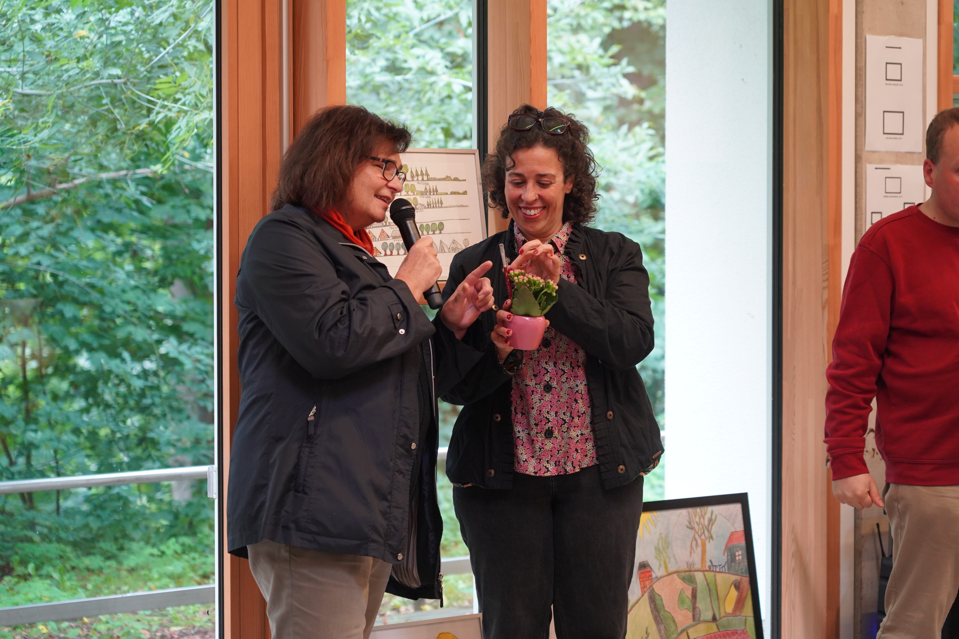 Fernández Furelos für ihre engagierte Arbeit mit einem Blumentopf, in dem zusätzlich zwei Pinsel steckten: „Ein ganz feiner für das sensible Händchen, dass Sie hier an jedem Tag brauchen, und ein ganz breiter für die ebenso wichtige kräftige Grundierung.“
