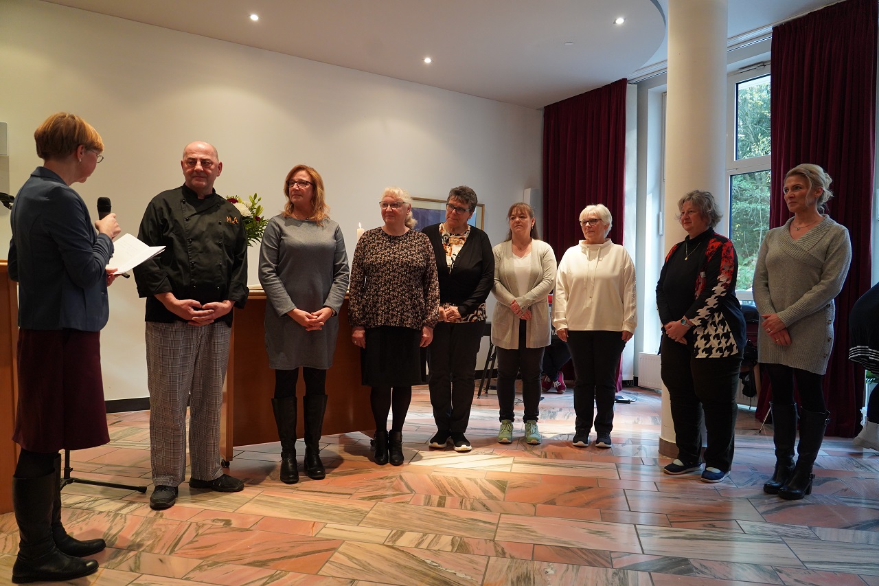 René Überschär und die Geschäftsbereichsleitung bedankten sich besonders bei sieben Mitarbeitenden, die seit der Gründung im Lazarus-Haus tätig sind und gemeinsam auf 235 Dienstjahre kommen. „Sie haben die Höhen und Tiefen, die Veränderungen und Herausforderungen dieser drei Jahrzehnte miterlebt und mitgestaltet. Sie sind das lebendige Herz dieses Hauses“, würdigte Überschär gemeinsam mit Christian Braungard und Katja Möhlhenrich-Krüger das Engagement dieser Mitarbeitenden.