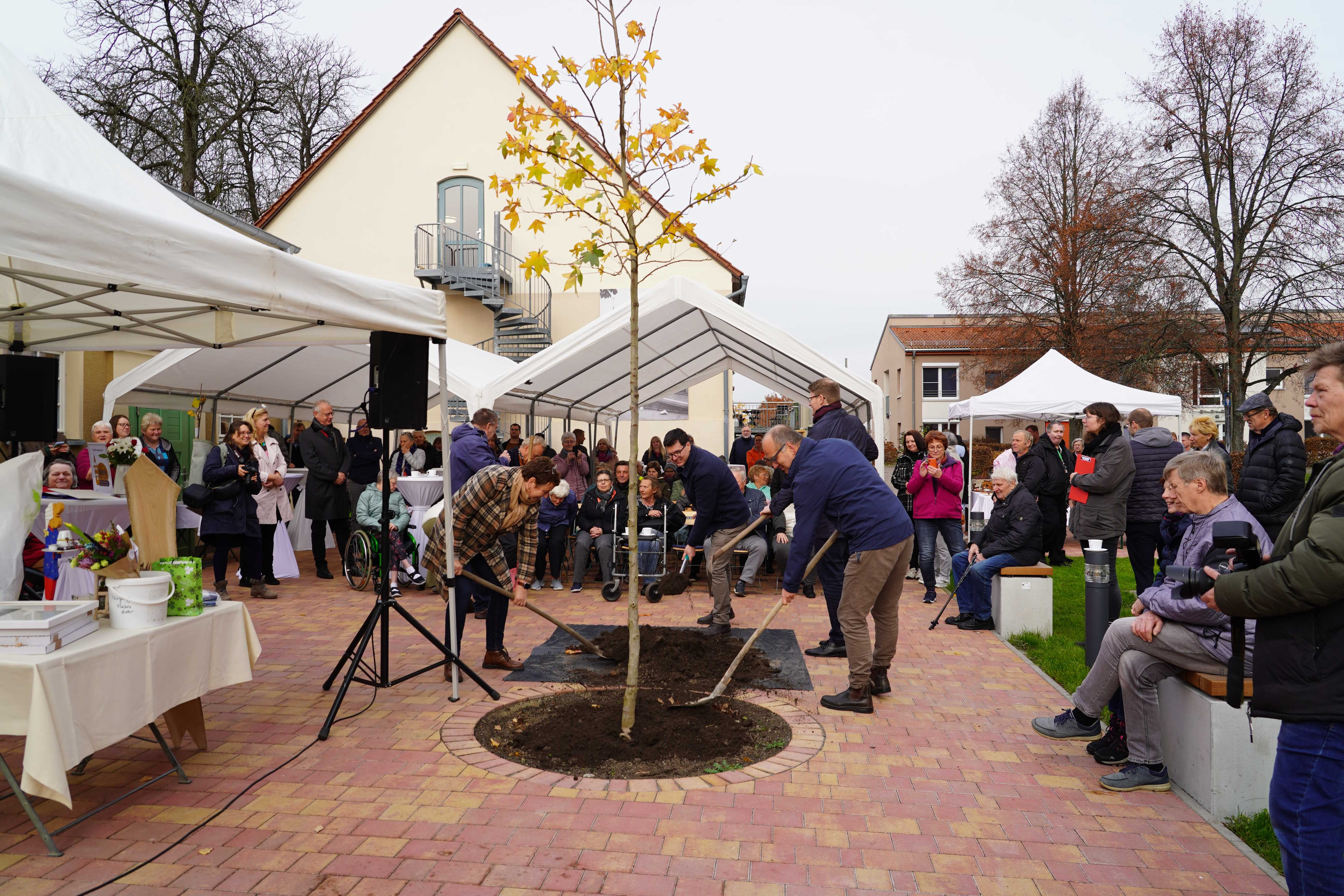 Bevor nun aber die Torte angeschnitten wurde, gab es noch was zu feiern. Zum Jubiläumsjahr in den Wohn- und Beschäftigungsangeboten wurde eine letzte Aktion gestartet: 100 Bäume für Reichenwalde. Der dafür benötigte Zuwendungsbescheid des NaturSchutzFond Brandenburg wurde vom dortigen Geschäftsführer Dr. Holger Rößling und Fördermittelmanagerin Stefanie Luka übergeben. Der erste Baum wurde auch gleich gepflanzt. Ein Amberbaum, der den Gästen in immer heißer werdenden Sommern Schatten spenden wird. Geplant ist weiterhin die Streuobstwiese zu reaktivieren, deren Früchte sich zukünftig auf den Tortenböden wiederfinden sollen.