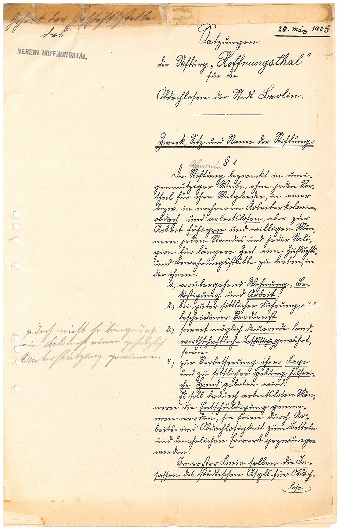 Der Inhalt der Satzung sind der Zweck, Sitz und die Rechtsform, die Bereitstellung des Vereinsvermögens, die Mitgliedschaft, die Vereinsorgane sowie Regelungen zur Abänderung der Satzung und Auflösung des Vereins. Spannend ist, dass der Verein Hoffnungstal in der Satzung zunächst versehentlich „Stiftung Hoffnungsthal“ genannt wurde.
