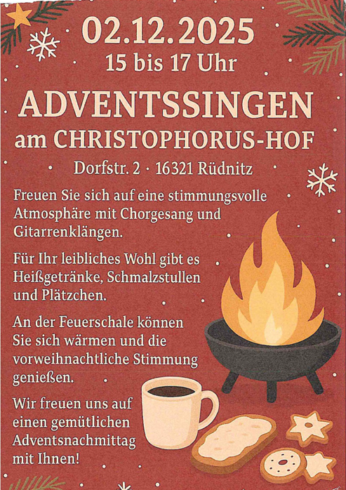 Am 2. Dezember 2025 von 15 bis 17 Uhr lädt der Christophorus Hof herzlich ein, die Vorweihnachtszeit gemeinsam zu genießen. Freuen Sie sich auf festliche Chorklänge begleitet von Gitarrenmusik und lassen Sie sich von den Darbietungen des Lobetaler Chors, unter Leitung von Herrn Dr. Hartmann und Herrn Hartwin Schulz, inspirieren.