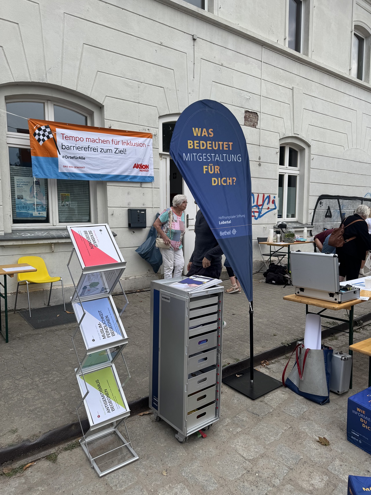 Der Stand besteht aus Beachflags, einem runden mobilen Messetisch, Sitzwürfeln und einem Rollcontainer voller Materialien – vom Infopaket in leichter Sprache bis hin zu interaktiven Fragenkarten. Alles ist so gestaltet, dass Menschen unkompliziert ins Gespräch kommen und sich einbringen können.
